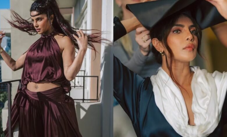 പ്രമോഷൻ പരിപാടികളുടെ തുടക്കത്തിൽ അതീവ മനോഹരമായ ഒരു വൈൻ-ടോൺഡ് സിൽക്ക് സാറ്റിൻ ഷിഫോൺ സെറ്റിലാണ് പ്രിയങ്ക പ്രത്യക്ഷപ്പെട്ടത്. ഈ വസ്ത്രത്തിന്റെ പ്രധാന സവിശേഷത അതിന്റെ ഫ്ലൂയിഡിറ്റി അഥവാ ഒഴുകിക്കിടക്കുന്ന സ്വഭാവമായിരുന്നു. ട്വിസ്റ്റഡ് ഹാൾട്ടർ നെക്ക്ലൈനും ബ്രെയ്ഡഡ് ട്രിമ്മുകളും താരത്തിന്റെ ഷോൾഡറുകൾക്ക് ഒരു സ്കൾപ്ചറൽ ഡ്രാമ നൽകി. അസമമായ ഹെംലൈനുകളും വോളിയം നിറഞ്ഞ ഫോൾഡുകളും വസ്ത്രത്തിന് ഭാരമില്ലാത്ത ഒരു അനുഭവം നൽകി. ഇതിനൊപ്പം പെയർ ചെയ്ത ഹാരെം പാന്റ്സ് ലുക്കിന് കൂടുതൽ ആഡംബരം നൽകി. പ്രശസ്ത ബ്രാൻഡായ ‘Zimmermann’നാണ് ഈ ഔട്ട്ഫിറ്റ് ഒരുക്കിയിരിക്കുന്നത്. ഇതിന് പൂരകമായി നൽകിയ ബ്രെയ്ഡഡ് ഹൈ പോണിടെയിലും മുഖത്തെ കൃത്യമായ കോണ്ടൂറിംഗും ലുക്കിനെ അങ്ങേയറ്റം ഷാർപ്പ് ആക്കി മാറ്റി.